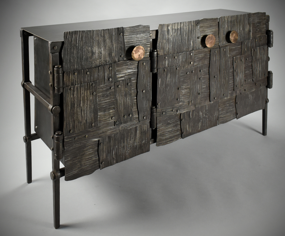 This work represents an idea of focusing on forms and line, texture and functionality. Ideas come from many places including the natural world I see every day outside the studio in south west Wisconsin’s “driftless area” and industrial blacksmithing techniques from the early years of the Industrial revolution. The joinery is out front to be seen rather than trying to hide it, it becomes an aesthetic part of each piece. The fronts of all the cabinet pieces have a story to tell, whether it’s an abstract representation of our agricultural area or a connection to the historical steel industry.